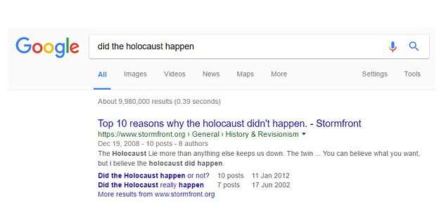 התוצאה הראשונה עבור חיפוש השאלה "האם השואה התרחשה?" היה מאמר שנכתב על ידי האתר, המפיץ אידיאולוגיה גזענית של עליונות לבנה וכותרתו: "10 סיבות שבגללן השואה כלל לא התרחשה".
