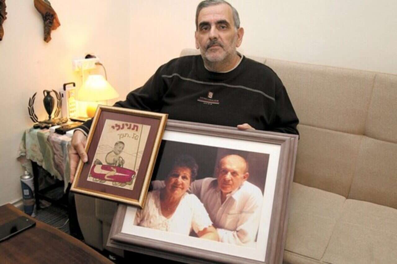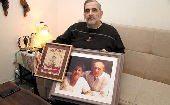 "בחיים לא תמיד יש הפי אנד". גיל גרינבוים עם תמונות ההורים שגידלו אותו // צילום: גדעון מרקוביץ