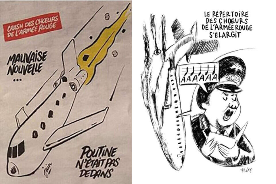 בקריקטורה אחרת, שהתייחסה ל־68 מחברי הלהקה שנספו באסון, צויר זמר כשמגרונו בוקע הצליל "אההההה" בזמן שהמטוס מתרסק, בליווי הכיתוב: "המקהלה מרחיבה את הרפרטואר". ממשרד ההגנה הרוסי נמסר: "אין זה מכבודו של איש להקדיש תשומת לב לתועבה העלובה".
