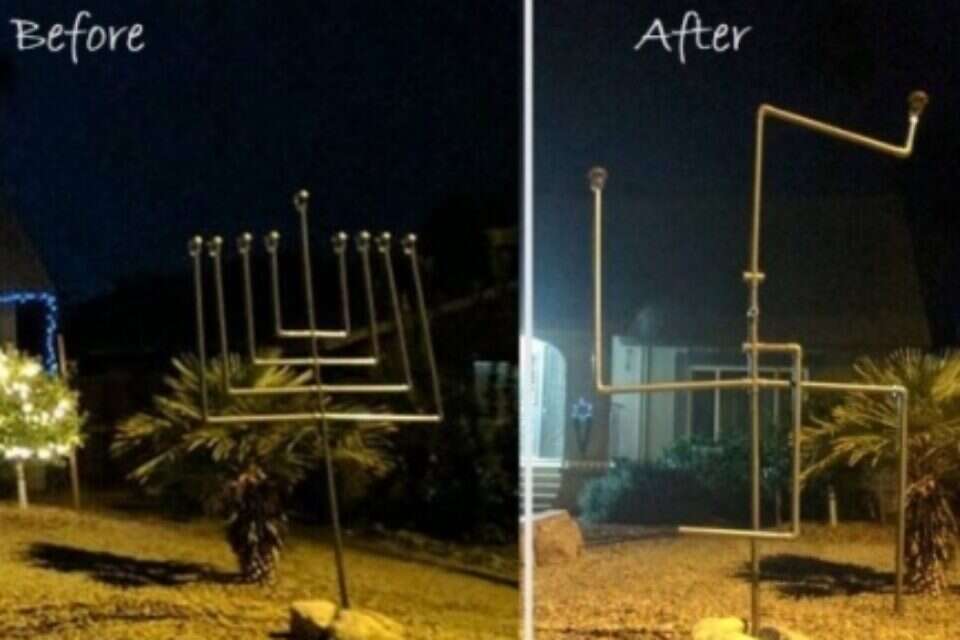 Unknown vandals mangled a menorah display outside a Jewish family's home in Chandler, Arizona, twisting it into a swastika, ABC15 Arizona reported Friday. Police were called to Naomi and Seth Ellis' home at around 5:30 a.m. Friday and helped disassemble the Nazi symbol. An investigation into the incident has been launched. According to the report, Seth Ellis had built the 7-foot-tall menorah out of PVC pipes for his three children, who had asked for a holiday display similar to the neighbors' Christmas decorations. To their horror, on Friday, the family woke up to discover the menorah had been bent into the shape of a swastika. "Just waking up to see that first thing is kind of rattling," Seth told ABC15. "It just makes me sad and it makes me feel sick that's still how people look at the world in 2016." "I broke down in tears waiting for the police to come and hoping that my kids would not be awake to see it," Naomi wrote on her Facebook page, in a post showing the display before and after it was mangled. "We live in a great neighborhood with kind and welcoming neighbors. We never would have imagined that someone would spread so much hate here. I'm still not sure how I will explain this to [my children]. I'm not sure I quite understand it myself. ... How can people be filled with so much hate and violence? To think that someone would make such an effort to hurt and vandalize a family, is downright sickening," she wrote. The post quickly went viral, garnering an outpouring of outpouring of support from the local community. Dozens of people gathered at the Ellis' home on Friday to rebuild and relight the menorah, ABC said.