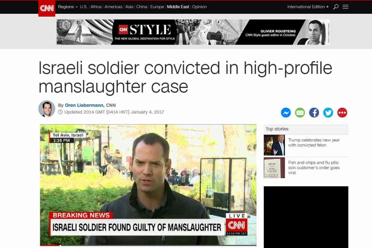 ברשת CNN ציינו כי "חייל ישראלי הורשע בהריגה במשפט מתוקשר". רשת החדשות האמריקנית דיווחה מישראל מספר פעמים אתמול, וכתבה בארץ, אורן ליברמן, ציין בין השאר כי "המשפט גרם לחילוקי דעות בציבור הישראלי".