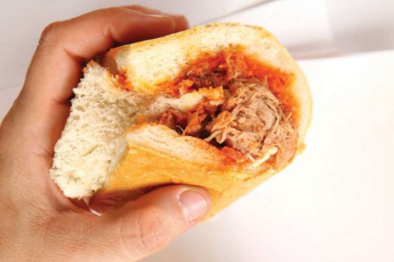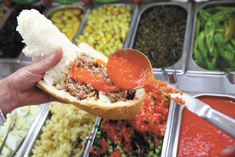 ואנחנו רוצות הכל מהכל. מבקשות להכביר במטבל הפלפלים החריף, העשוי פלפל שאטה ופלפל סודנייה והוא חריף ולוהט וטעים עד מאוד. וכן בפיסות הלימון הכבוש, מפני שאין כמו אלה כדי להעניק רעננות לכל מרכיבי הכריך. היו שם כמובן גם פרוסות ביצה קשה, קוביות תפוחי אדמה מבושלים, סלט ירקות קצוץ ונתחי טונה בשמן.
