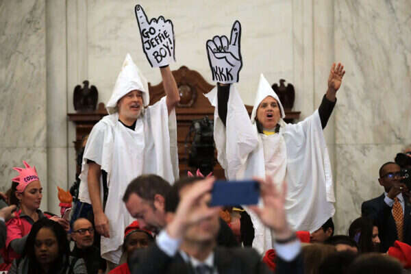 למרות הצהרותיו המתונות, יש לא מעט אנשים שסשנס כבר לא ישכנע. דקות לפני תחילת השימוע, הפגינו כמה פעילי שמאל בתלבושות קו־קלוקס־קלאן, וקראו קריאות ביניים. כשהוחלט להוציאם מהאולם, קרא אחד מהם: "אתם לא יכולים להוציא אותי מכאן, אנחנו לבנים. הממשלה הזאת שייכת ללבנים". במקביל, הסנאטור הדמוקרטי קורי בוקר, אחד משלושה סנאטורים אפרו־אמריקנים, הודיע כי יעיד היום נגד עמיתו לסנאט, במה שנחשב צעד נדיר מאוד.