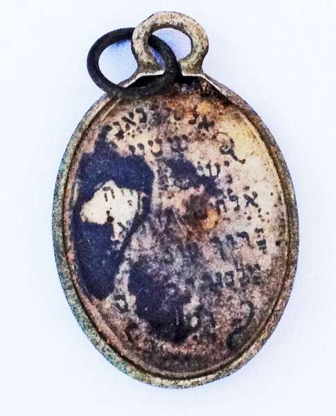 תליון המתכת מצופה הזכוכית שנמצא ועליו תפילת "שמע" // צילום: רשות העתיקות