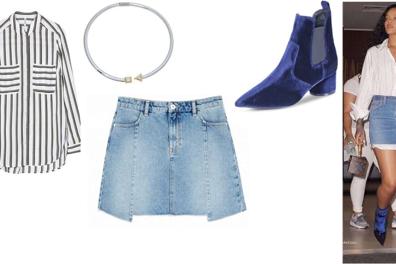 להראות כמו ריהאנה מגפי קנדל וקיילי // צילום: אסף לוי, שרשרת ג'ניפר לאב // צילום: נמרוד קופולטו, חצאית ג'ינס ברשקה // צילום: יח"צ חו"ל, חולצה מכופתרת סטרדיוריוס // צילום: יחצ חו"ל // להראות כמו ריהאנה מגפיים: קנדל וקיילי, שרשרשת: ג'ניפר לאב חצאית ג'ינס: ברשקה חולצה מכופתרת: סטרדיוריוס