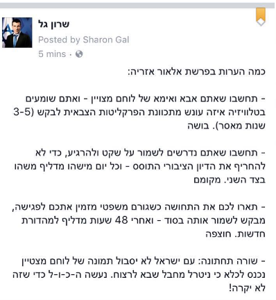 דקות לאחר הפרסום בערוץ 2, העלאה לפייסבוק העיתונאי שרון גל סטטוס לפייסבוק בו המשיך בקו עליו דיבר מיד לאחר פסק הדין כי אזריה לא יישב בכלא. גל כתב: "עם ישראל לא יסבול תמונה של לוחם מצטיין נכנס לכלא כי ניטרל מחבל שבא לרצוח.