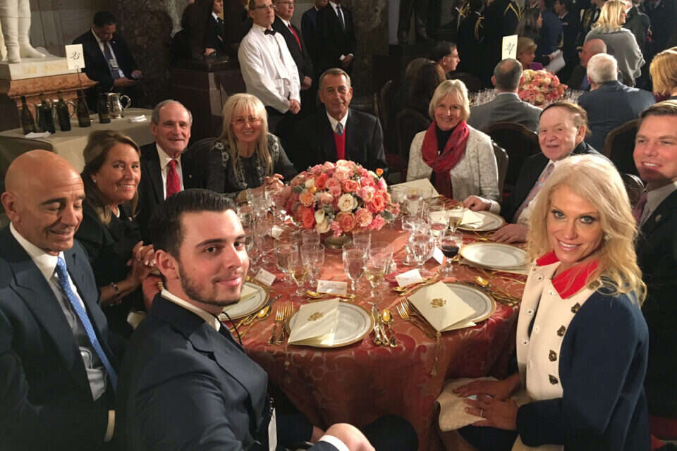 בני הזוג ד"ר מרים ושלדון אדלסון בארוחת הצהריים לכבוד ההשבעה, שנערכה בבניין הקפיטול מייד לאחר הטקס. בתמונה, מימין: קליאן קונוויי, שלדון אדלסון, חמישית מימין ד"ר מרים אדלסון ולשמאלה יו"ר בית הנבחרים לשעבר ג'ון ביינר. משמאל: תום בארק, מארגן חגיגות ההשבעה ולימינו בנו בועז ביסמוט, וושינגטון