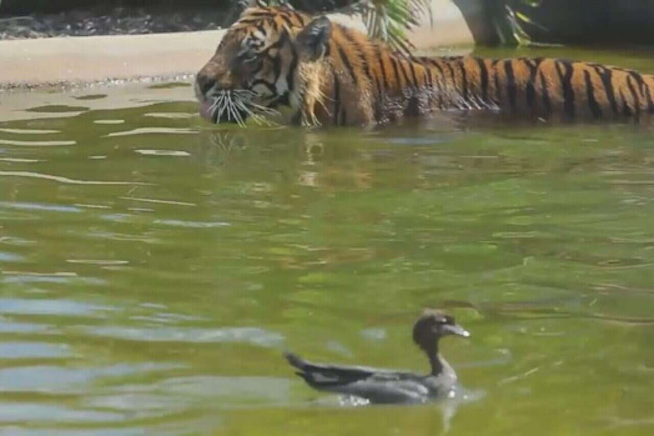 בסרטון נראה הברווז השחור שוחה להנאתו באגם המלאכותי שנמצא בכלוב החתול האימתני. הטיגריס שביקש לצנן את חום גופו בטבילה במים הקרירים כנראה לא אהב את נוכחותה של הציפור והחל לעקוב אחריה.
