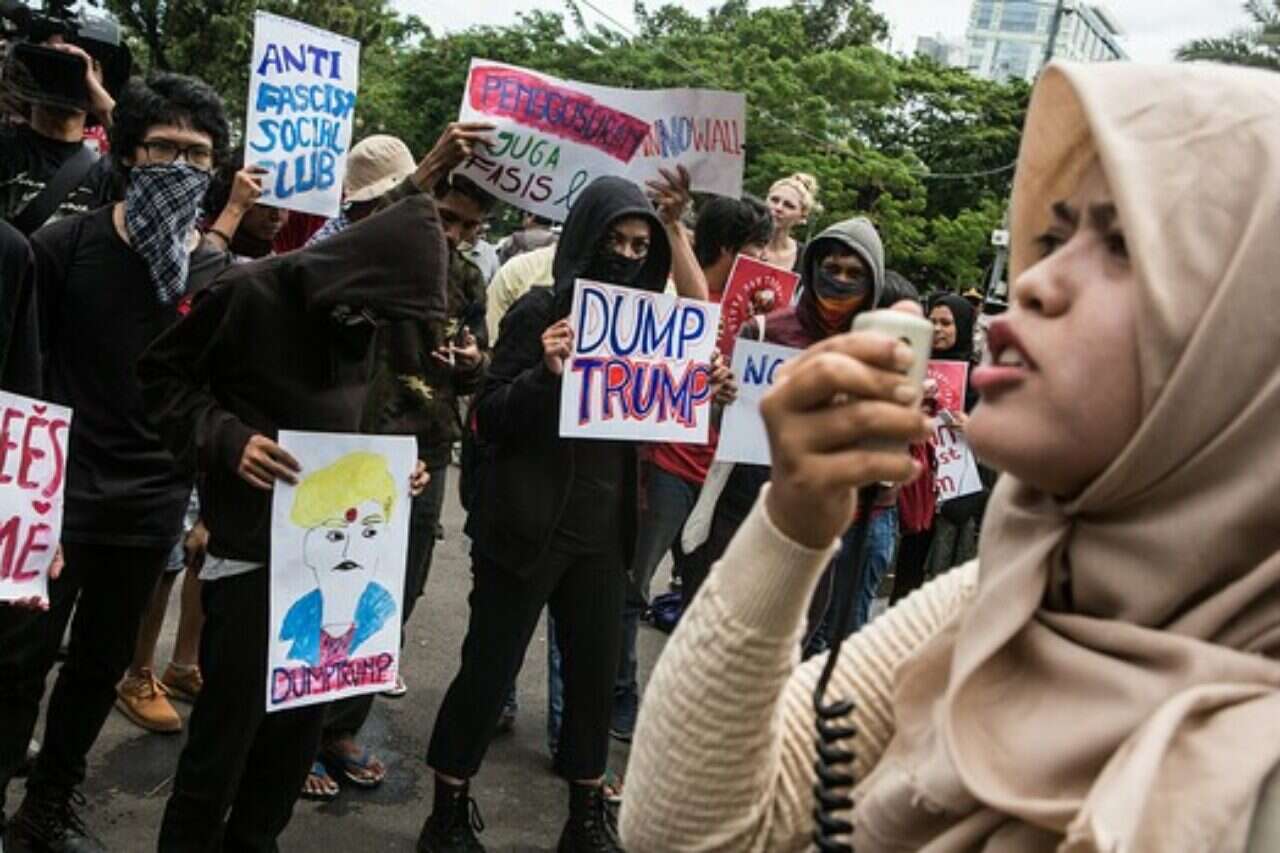 בחלק מההפגנות היה אפשר לראות תמונות של טראמפ עם שפם קטן; הוכחה, למרות הטעם הרע, שחופש הביטוי נותר ערך עליון בארה"ב, מה שלא ניתן לומר על המדינות שהוזכרו בצו.