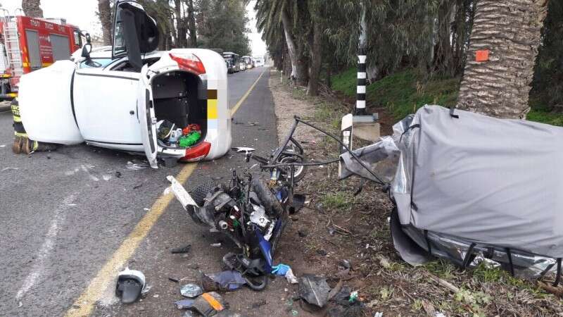 זירת התאונה הקשה בין פרדס חנה לבנימינה. "הרכב פגע בקלנועית והתהפך" // צילום: אייל דרורי דוברות מד"א