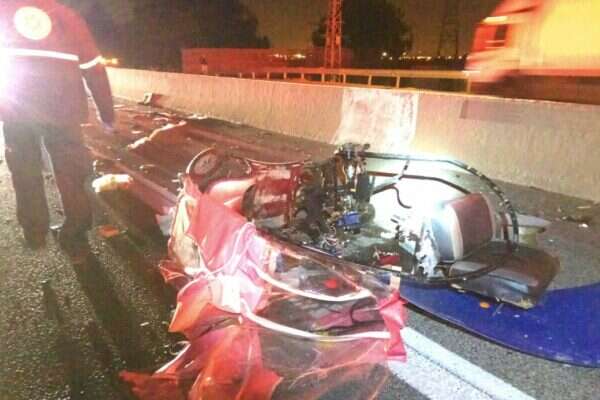 זירת התאונה הקשה בין פרדס חנה לבנימינה. "הרכב פגע בקלנועית והתהפך" // צילום: אייל דרורי דוברות מד"א
