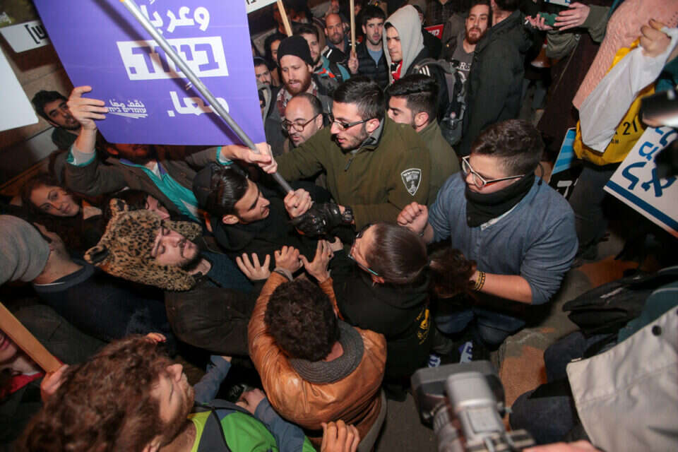 אנשי השמאל שהיו במקום, כ־200 במספר, תמכו בקיום ההרצאה וקראו "יהודים וערבים מסרבים להיות אויבים". מנגד, כ־100 אנשי הימין שהגיעו לגלריה קראו לביטול ההרצאה, שתוכננה להתקיים במתקן שמופעל על ידי עיריית ירושלים. במפגיני הימין היה המשנה לראש עיריית ירושלים, דב קלמנוביץ, ממובילי המחאה נגד קיום ההרצאה, שאמר: "לא עולה על הדעת שההרצאה מתקיימת. חבל שהעירייה לא שמעה בקולי וביטלה אותה".