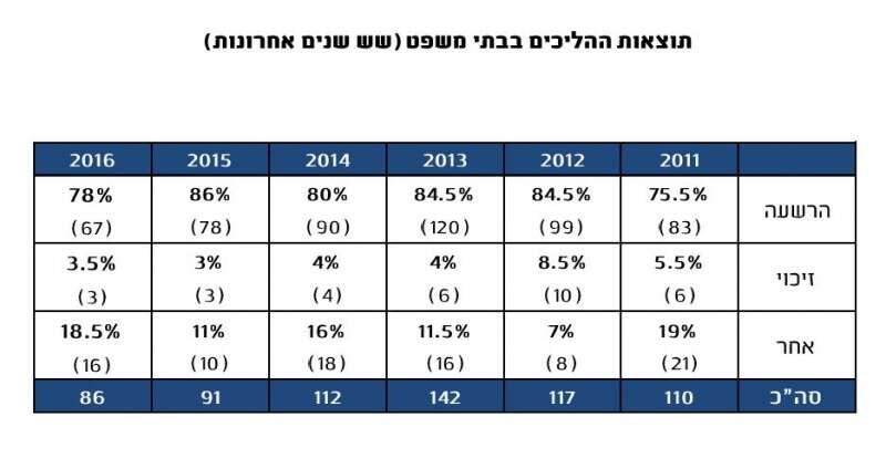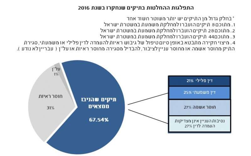 כ-78% מהתיקים שנוהלו על ידי פרקליטי מח"ש הסתיימו השנה בהרשעה או בקביעה שהשוטר ביצע עבירה פלילית, וכ-3% הסתיימו בזיכוי בבית המשפט. יתר התיקים הסתיימו בהסדרים שונים שכללו העברה לדין משמעתי, עיכוב הליכים וכיוצא בזה.