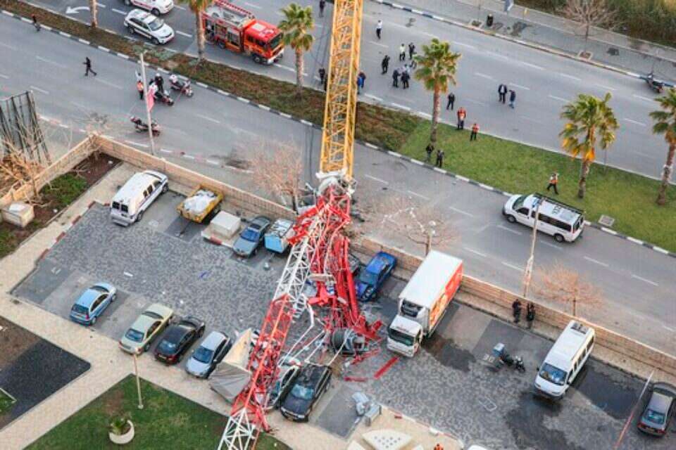 המנוף שקרס. הגיע עד חניית הבניין // צילום: יהושע יוסף