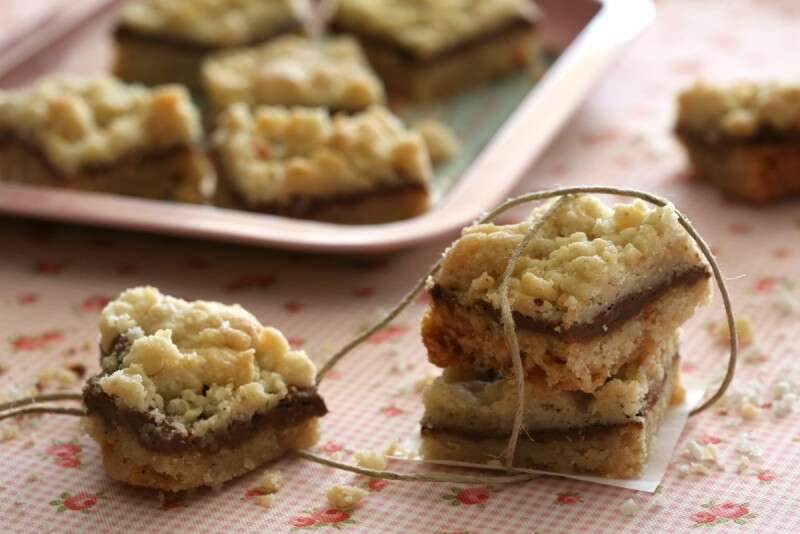 6. מוציאים מהתנור ומצננים מעט. מורחים שכבה נדיבה של ממרח נוטלה, מכסים בפירורי בצק ומחזירים לתנור.