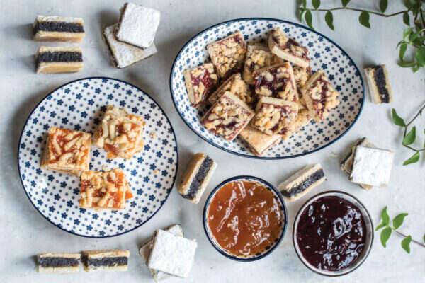 אופים 25-20 דקות עד להזהבה קלה, מוציאים מהתנור ומצננים שעה לפחות. מחלצים מהתבנית בעזרת נייר האפייה, מפדרים באבקת סוכר וחותכים לריבועים בגודל 4x4 ס"מ.