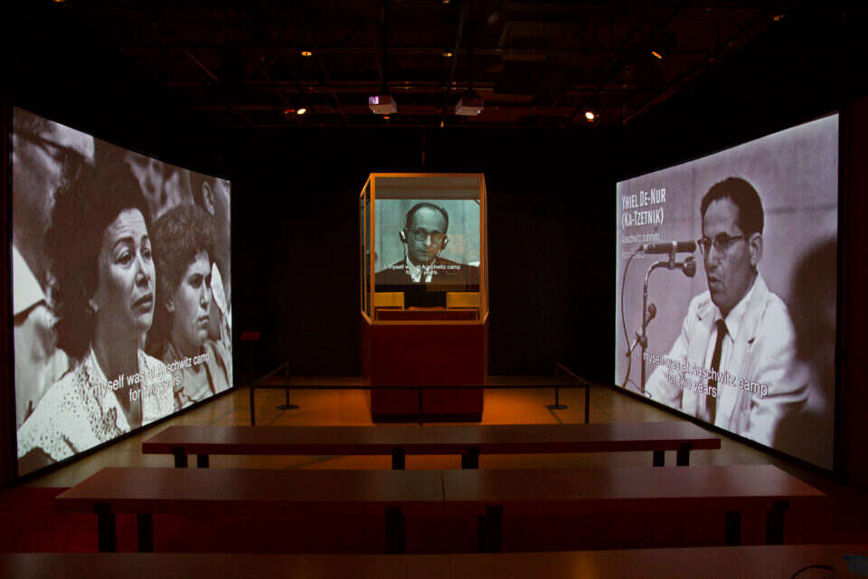 פושע המלחמה תכנן לחיות את חייו בחשאי בארגנטינה. בתערוכה מוצגת הדרך לתפיסתו של אייכמן במדינה על ידי המוסד, שגם הבריח אותו מחוץ לארגנטינה עד לירושלים, שם הובא בפני שופט. המשפט המצולם של אייכמן מציג אותו מוגן מאחוריי זכוכית משוריינת, בזמן שהעדים תיארו את הפשעים הנוראיים בהם הוא נמצא אשם.