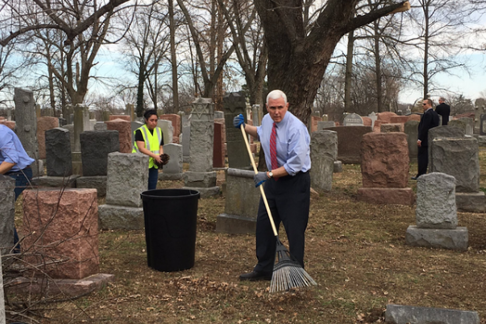 לדבריו, "אנו מגנים באופן הברור ביותר את המעשה הנתעב הזה." פנס הוסיף כי "אין מקום לשנאה, לדעות קדומות או אנטישמיות בארה."ב" תחת אבטחה, סגן נשיא ארה"ב הפשיל שרוולים והחל לעזור בשיקום בית הקברות.