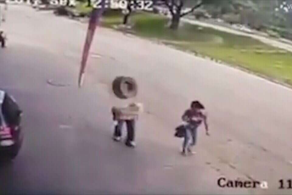 המקרה המבהיל הזה התרחש לפני מספר שבועות במזרח המדינה, אחרי שצמיג השתחרר מרכב שבא מהכיוון ההפוך. הצמיג התגלגל וקפץ מספר פעמים על הכביש, מבלי שבני הזוג שהלכו לתומם כשגבם לכיוון הצמיג.