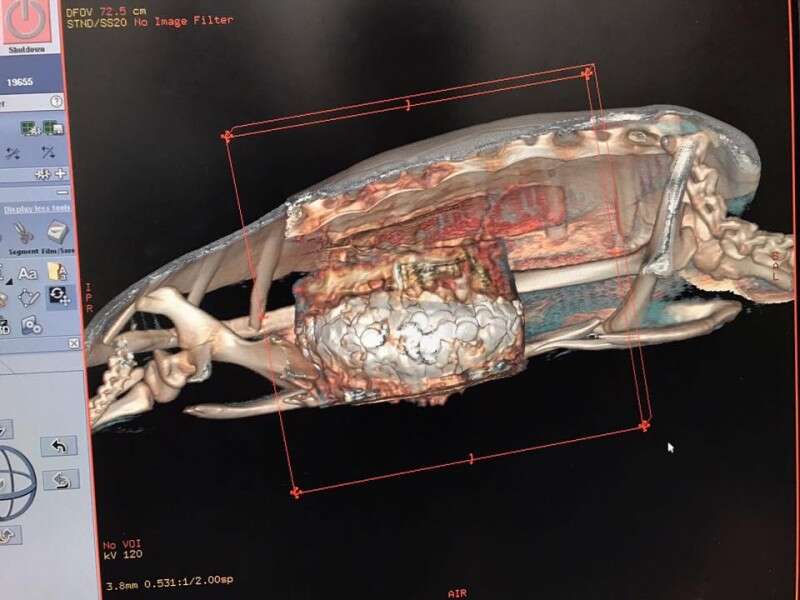 הווטרינרים במרפאת החיות מיהרו לערוך סריקת סי.טי לזוחל העצום, וגילו בבטנו ערימת מטבעות ברוחב 23 ס"מ ובאורך 30 ס"מ. סך הכל נמצאו בבטנו של בנק מטבעות בסך 2,000 בהאט, כ-57 דולר. המטבעות, שזרקו תיירים מתוך אמונה שהדבר יביא להם מזל טוב, גרמו לסדקים בשריון הצב ולזיהומים. מלבד המטבעות הרבים שנלכדו בבטן הצב נמצא גם קרס דיג.