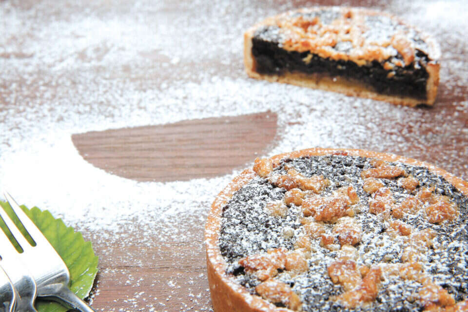 6. להרכבת הטארטים: ממלאים את קלתית הטארטים במילוי הפרג לגובה כ־1 ס"מ. מפזרים מעל פירורי שטרויזל ומקררים במשך כשעה.