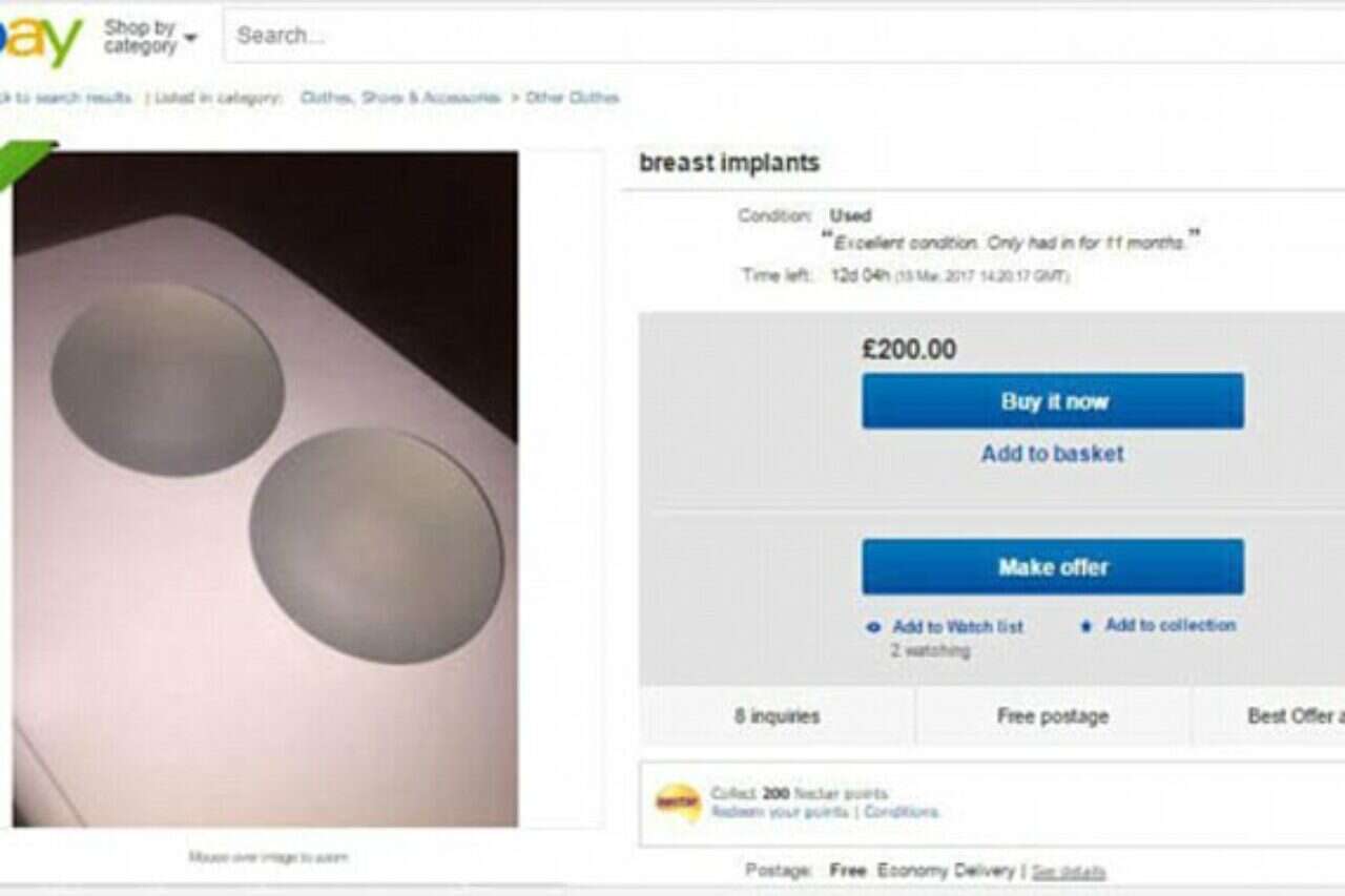 באתר המכירות איביי נמכרים שלל דברים הזויים, אבל אולי הפעם נשבר שיא חדש, לאחר שאישה בריטית המכונה "קאט", מהעיירה רולי רג'יס באנגליה, הציעה למכירה את שדיה המלאכותיים! "שתלי הסיליקון שלי 'במצב מצוין'", ציינה קאט במודעה, "היו בשימוש רק 11 חודשים". היא ביקשה עבורם 200 פאונד.