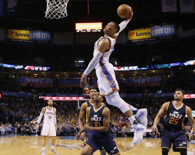ווסטברוק מטביע את הג'אז. טריפל דאבל 32 העונה // צילום: אי.פי