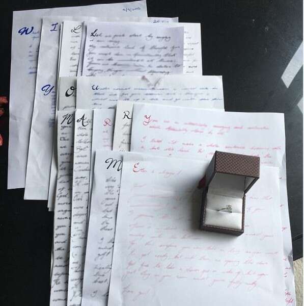 ואז היא גילתה את המחווה הרומנטית האמיתית - כל אחד מ-14 המכתבים מתחיל באות גדולה, כך שאם מחברים כל אות גדולה ב-14 המכתבים, התוצאה היא "התינשאי לי?".