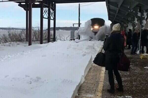 רכבת נוסעים של "אמטרק" הנוסעת בתוך העיר נסעה לתוך שלג עבה שהצטבר על הקרקע. הסרטון מראה כיצד הרכבת התנגשה בערימות השלג הבלתי נגמרות – והעיף את המים במצב צבירה מוצק על נוסעי הרציף.