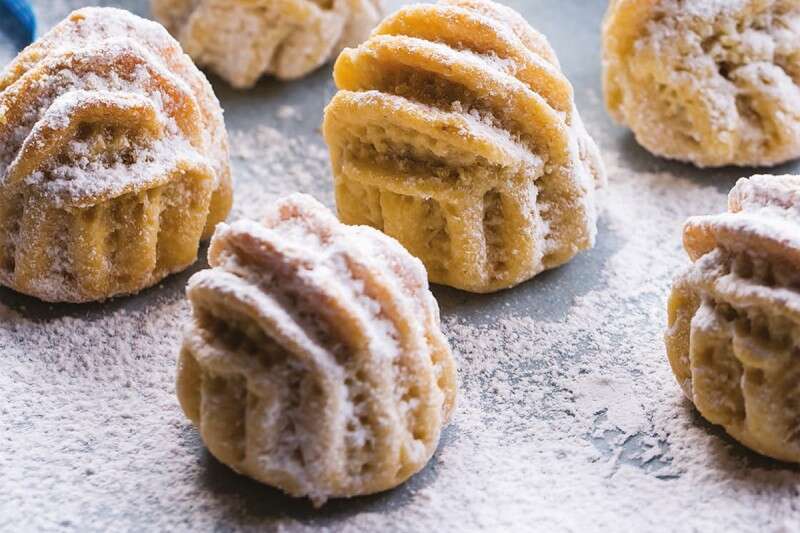 מעצבים, ממלאים ואופים: יוצרים מהבצק כדורים בקוטר 4 ס"מ. במרכז כל כדור יוצרים גומה בעזרת האצבע, ומסובבים סביב האצבע עד שדופנות הגומה בעובי 3 מ"מ. ממלאים את הגומה במלית וסוגרים. צובטים את הבצק בעזרת הפינצטה עד לקבלת דוגמה של מעמול, כך שמתקבלים פסים בחלקו העליון של הכדור וסביב הדפנות. מסדרים בתבנית מרופדת בנייר אפייה ואופים 20 דקות עד להזהבה קלה. מצננים היטב ובוזקים אבקת סוכר.