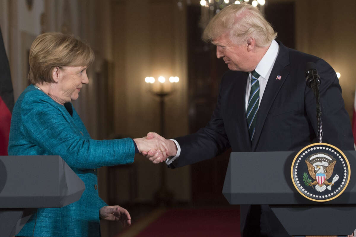 ב"פוטו אופ" המסורתי שטראמפ ערך עם מרקל בחדר הסגלגל, הכתבים ביקשו מהשניים כמה פעמים ללחוץ ידיים, ומרקל שאלה את טראמפ, "אתה רוצה שנלחץ יד?" אך טראמפ לא הגיב. לא ברור אם בכלל שמע את שאלתה של מרקל או שמחשבותיו היו במקום אחר, אך מכל מקום, שני המנהיגים באירוע ציינו כי השיחות ביניהם היו טובות. כך או כך, השניים לחצו יד בחמימות לאחר מסיבת עיתונאים משותפת, וטראמפ מיהר להאשים את התקשורת בדיווח שגוי. "למרות כל מה ששמעתם מהחדשות המזויפות, היתה לי פגישה מצוינת עם קנצלרית גרמניה", אמר.