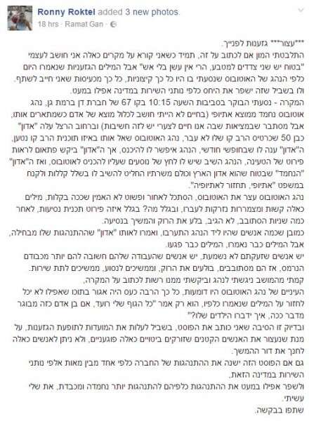 כותב הפוסט ציין כי "הנהג השיב שיש לו לחץ של נוסעים ושעליו להיכנס לאוטובוס, ואז ה'אדון הנחמד', שבטוח שהוא אדון הארץ וכולם משרתיו, החליט להשיב לו בשלל קללות ולקנח במשפט 'אתיופי, תחזור לאתיופיה'.