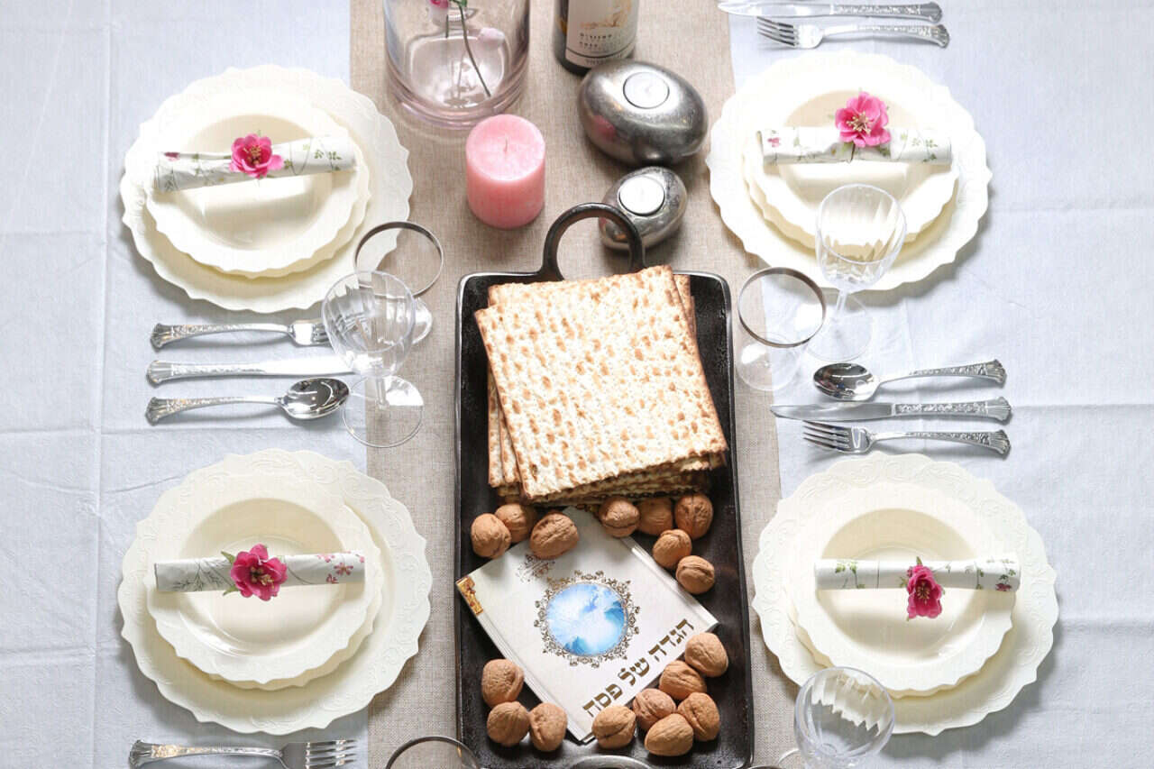 עוד על השולחן: מפה חד־פעמית לבנה, חבק מפית פרח יוטה, ראנר יוטה טבעי, עציץ פרחים ורודים מפלסטיק, 3 גבעולי פרחים ונר ריחני ורוד - פעמית סטור • קערה כסופה למצות, מלחייה ופלפלייה, שני פמוטי חלוקי נחל - Floralis • הגדה - ניצחתי ואנצח • אגרטל שקוף־ורוד - פוקס הום • יין רוזה מהסידרה האזורית - יקבי כרמל • מצות - אביב