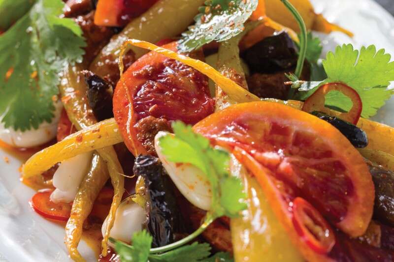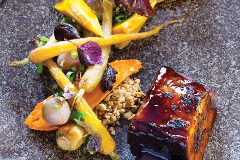 שפונדרה צלויה עם ירקות כתומים ושזיפים