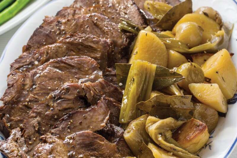 מחממים את שומן העוף או השמן בסיר כבד, וצורבים בו את נתח הכתף בשלמותו עד שהוא משחים יפה מכל הצדדים. מניחים בתבנית צלייה את השום, הבצלים, הכרישות ותפוחי האדמה, מתבלים בעלי דפנה, תימין, פלפל אנגלי, מלח ופלפל שחור ומניחים מעל את נתח הבשר. יוצקים לתבנית כוס מים, מכסים בנייר אפייה ובנייר אלומיניום וצולים בתנור שחומם ל־160 מעלות במשך 4 שעות או עד לריכוך מוחלט. מצננים היטב ופורסים דק. מחממים לפני ההגשה.