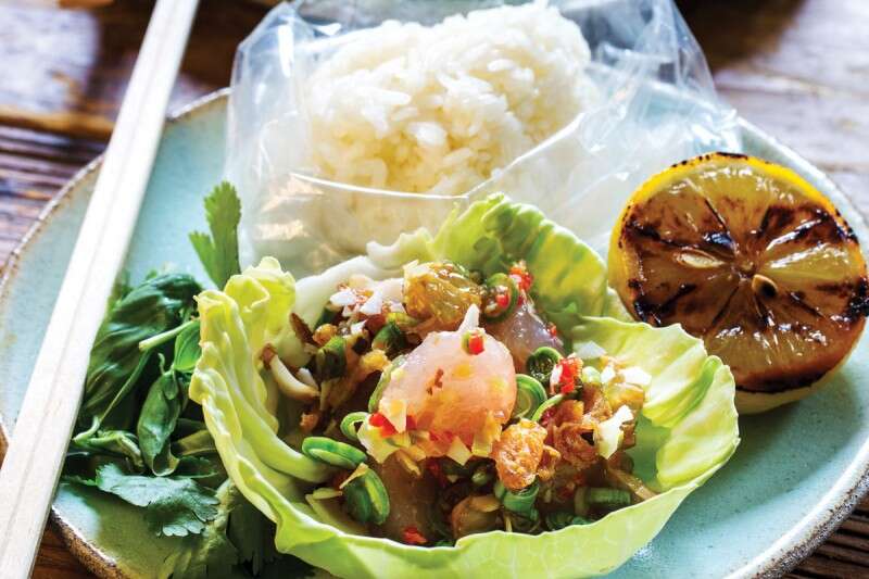 לקראת ההגשה, יוצרים סירות מעלי הכרוב ומניחים בתוך כל סירה כ־2 כפות מהסלט עם קוביות הדג. מגישים את האורז בצלוחית לצד המנה או בשקיות קוקי.