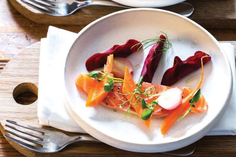 פורסים על הצלחות את נתחי הדג לפרוסות דקות, ולידן מניחים כיסוני סלק, ירקות מוחמצים ועלים טריים.