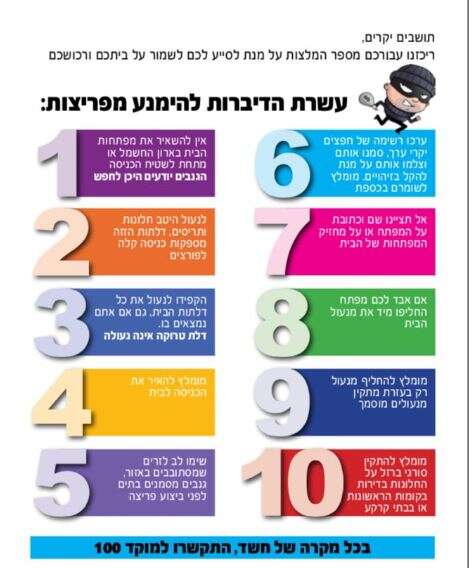 בימים האחרונים הכינה המשטרה בשיתוף עם מנהל קהילה, תרבות וספורט באגף דרום בעירית ת"א, פלאיירים המיועדים לתושבים ובהם מופיעים עשרת הדיברות לתושב שאם יקפיד על ביצוען יסייע למניעת ההתפרצות לבית המגורים שלו. הפלאיירים חולקו בתיבות דואר, בקניונים ובאמצעות המייל.