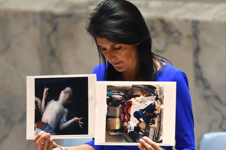 מי שהשמיעה דברים בוטים יותר היתה שגרירתו של טראמפ באו"ם, ניקי היילי. בדיון חירום במועצת הביטחון הציגה היילי צילומים של גופות ילדים ואמרה: "האמת היא שלאסד, לרוסיה ולאיראן אין שום אינטרס בשלום. כמה ילדים נוספים צריכים למות כדי שלרוסיה יהיה אכפת? רוסיה אינה יכולה לחמוק מהאחריות". היילי רמזה שארה"ב עשויה לפעול לבד: "כאשר האו"ם נכשל באופן שיטתי למלא את תפקידו ולפעול יחד, יש רגעים בחיים של מדינות שבהם אנחנו נאלצים לנקוט פעולות בעצמנו".