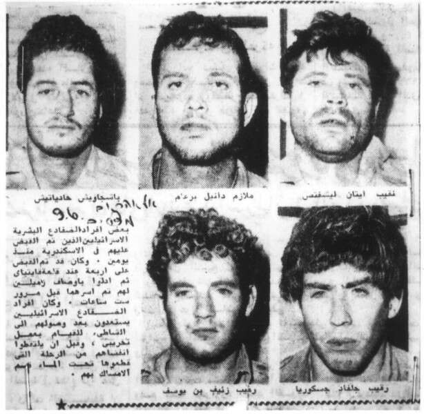 השבויים בצילום מהעיתון "אל־אהראם". למעלה מימין: ליפשיץ, ברעם ופטיש. למטה: שני ובן יוסף