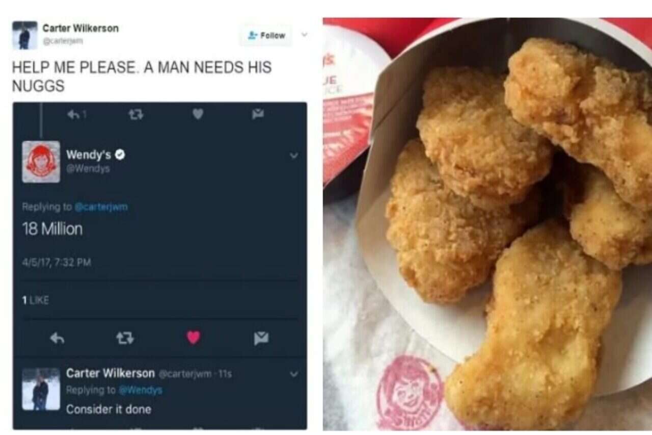 במסגרת השתוללות הצ'יקן נאגטס של הצעיר האמריקני הוא צייץ לרשת המזון המהיר וונדי'ס את השאלה "כמה ציוצים מחדש צריך לקבל הציוץ שלי על מנת שאוכל לקבל נגיסי עוף בחינם לשנה שלמה?".