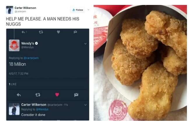 קרטר ווילקרסון, כל כך אוהב את מנת נגיסי העוף ברשת מזללות המזון המהיר וונדי'ס שהוא שינה את התיאור העצמי שלו ברשת החברתית טוויטר למשפט: "אני אוהב נגיסי עוף".