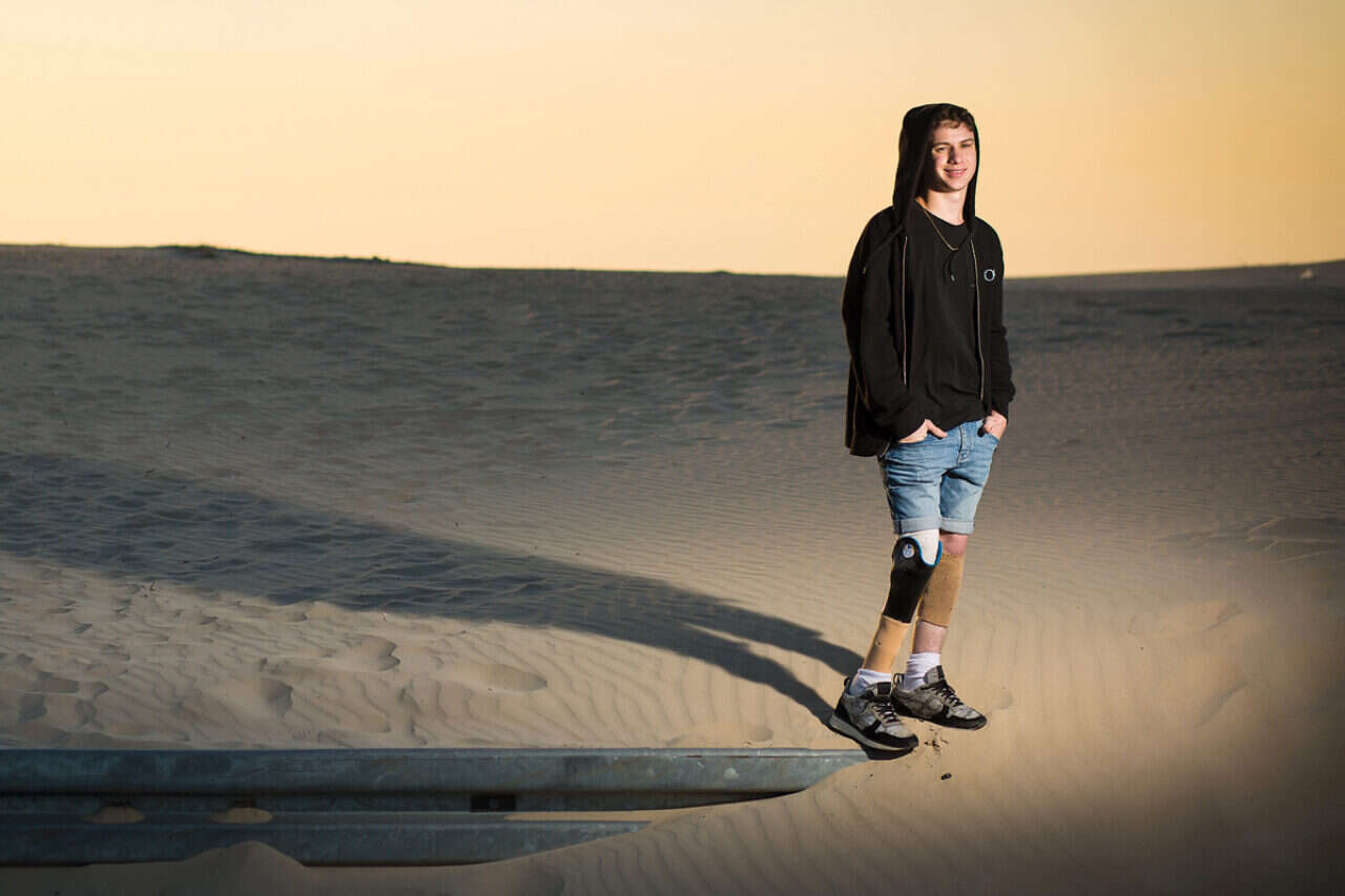 הליכתו הבטוחה אינה מסגירה כל רמז לפציעה או לתותבת, גם כשהוא גומא במהירות את המדרגות המובילות לחדרו. זה חדר רגיל של נער מתבגר, עם טלוויזיה גדולה וקונסולת פלייסטיישן. על השולחן מונחים בערימה ספרי לימוד, חוברות ומחברות, ומולם ספה אפורה ועליה שלל כריות צבעוניות. רק הפרוטזות הישנות, המוטלות ליד ארון הבגדים, נראות חריגות.