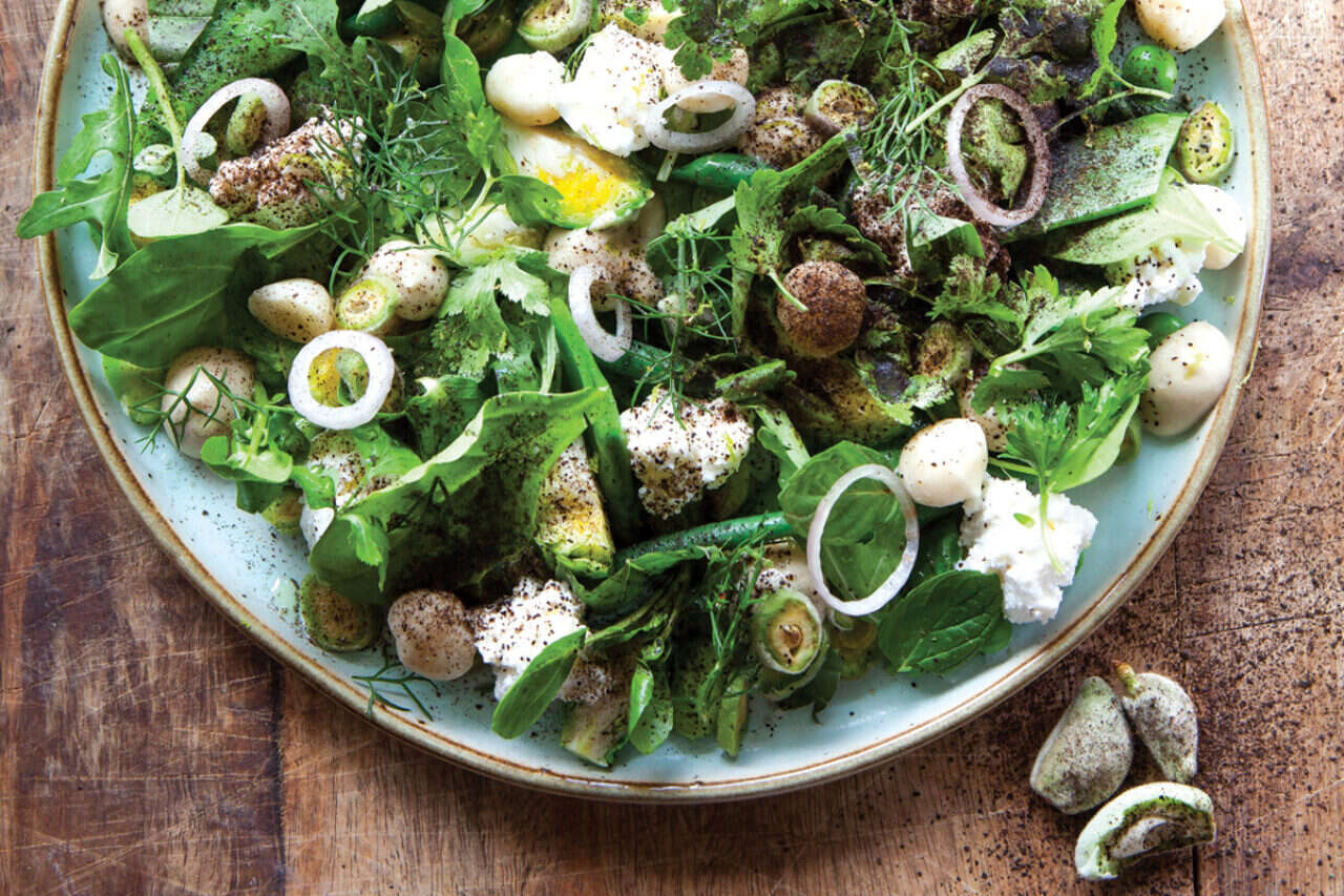 לא רק עונתו של השקד הירוק עכשיו, אלא שלל ירוקים ממלאים את שוקי הארץ. המנה הזאת מגישה אותם כמו שהם, שדה של ירוקים עם קרמיות גבינתית ומעט טעמי עישון מהחציל.
