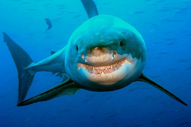 נחום בחברת כריש לבן. מצלם מקרוב - וללא הגנה // צילום: Jeb Corliss