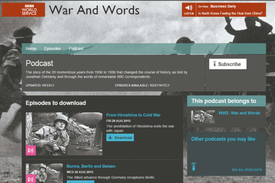 BBC: War and Words: אפשר לסמוך על ה־BBC שתציע מבחר עשיר ואיכותי של פודקאסטים שעניינם מלחמת העולם השנייה. מי שנרשם יכול למצוא באתר פודקאסטים כגון "בורמה, ברלין ובלזן", המתאר את גרמניה כפי שהיא נראתה מנקודת מבטן של בעלות הברית הכובשות את האזור. "מהירושימה למלחמה הקרה" עוסק לעומת זאת בהשמדת הירושימה ובתבוסתה של יפן, ו"D-Day and the Liberation of Normandy" עוקב אחר האירועים שהפכו את הקרב לאחד הידועים בהיסטוריה.