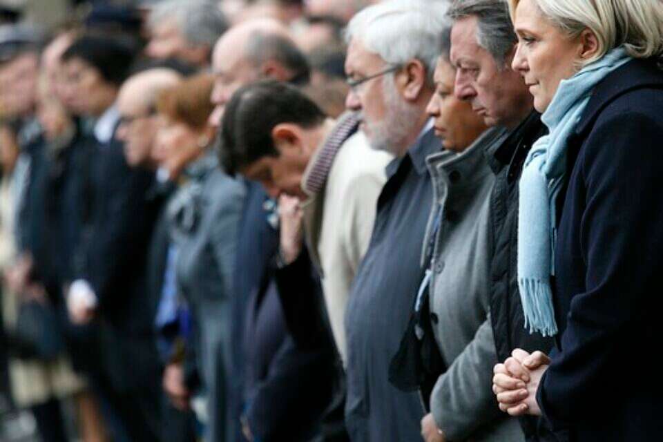 נשיא צרפת, פרנסואה הולנד והמועמדים עמנואל מקרון ומריאן לה פן, נכחו ביחד עם עוד רבים אחרים בלוויית של השוטר, חוויאר ג'וגל.