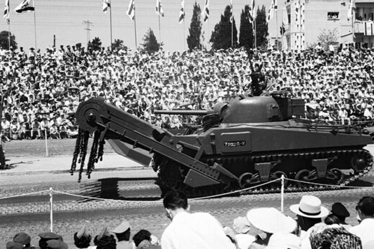 בתמונה: טנק מצויד במערכות לפיצוץ מוקשים של חיל ההנדסה, במהלך המצעד ברחובות תל אביב, ביום העצמאות ה־11 של מדינת ישראל // צילום: משה פרידן/לע"מ