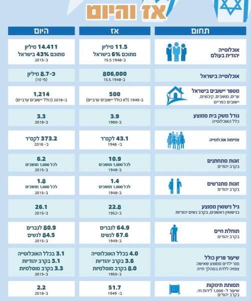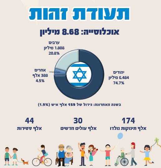 מאז יום העצמאות אשתקד גדלה אוכלוסיית ישראל בכ-159 אלף איש, גידול של כ-1.9%. בתקופה זו נולדו בישראל כ-174 אלף תינוקות; עלו לישראל 30 אלף איש ונפטרו כ-44 אלף איש.
