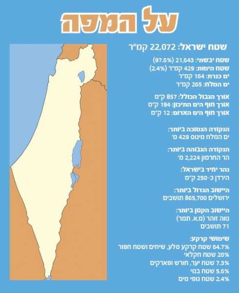 שטח מדינת ישראל הוא 22,072 קמ"ר. שטח הדומה לסלובניה ואל-סלוודר, כמחצית מזה של הולנד ושל שוויץ. כמו כן, מדינת ישראל גדולה פי 30 מסינגפור, אך נכנסת כ-450 פעמים בשטח של ארה"ב או סין.